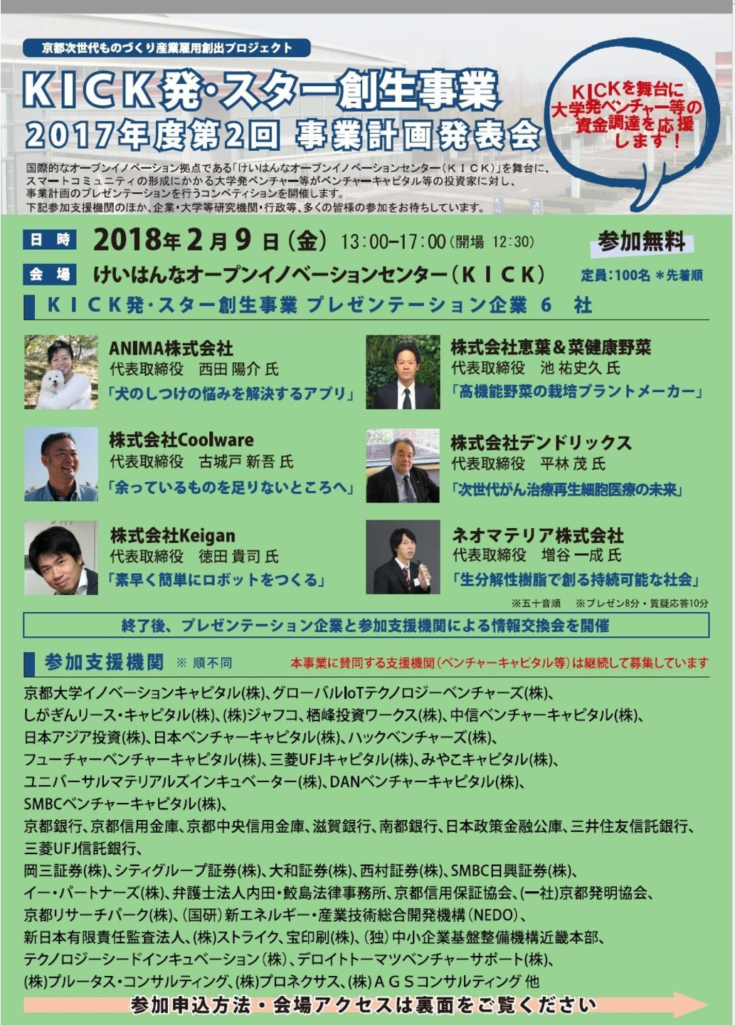 KICK発・スター創生事業2017年度第2回事業計画発表会の開催及び来場者の募集について