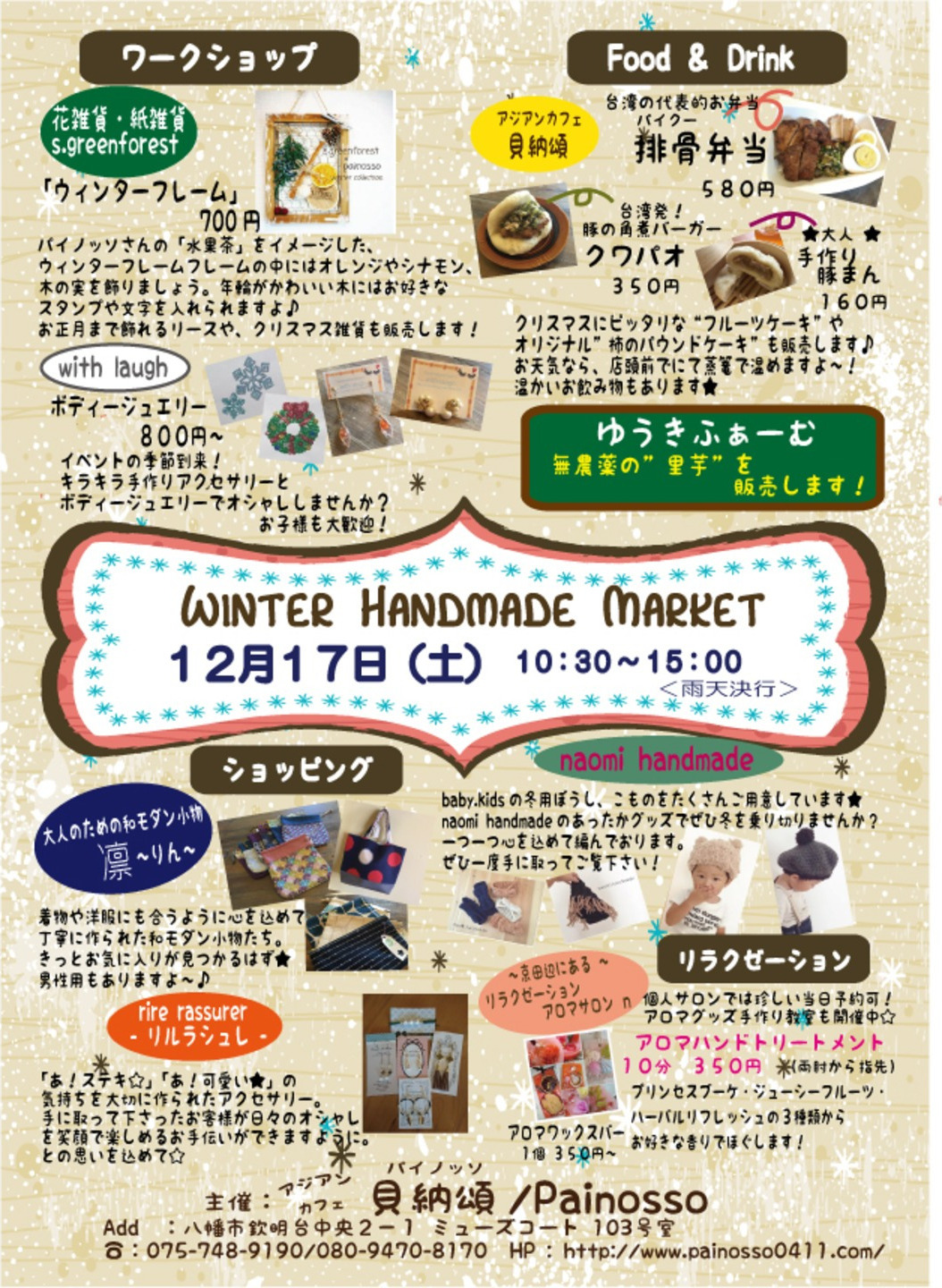 ワークショップやリラクゼーション、雑貨やアクセサリーの販売等、いろんな事が盛りだくさんのイベントです。
